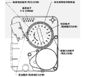 定時器上第二組插銷與第三組插銷之間的孔數是控制注水時間長短的。每一孔相當于 2分鐘,調整時以移動第三組銷子的位置來增減孔數。當外面的一個微開關接觸到第三組的兩根銷子時,再生程序終止。可是定時器會繼續旋轉直至里面的一個微動開關接觸臂轉至定時器的圓形凹口內為止。