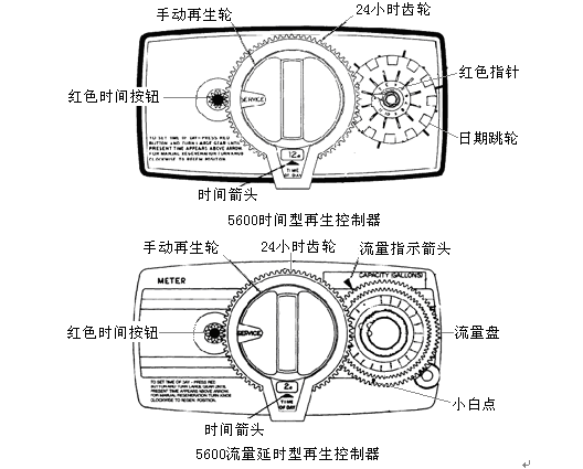 5600控制閥再生控制器選用的是機械式,由時間馬達控制再生程序各步驟工作時間,同時也作為驅動裝置的動力源,并且只有時間型和流量延時型(出水口處安裝有流量計),而沒有流量即時型。