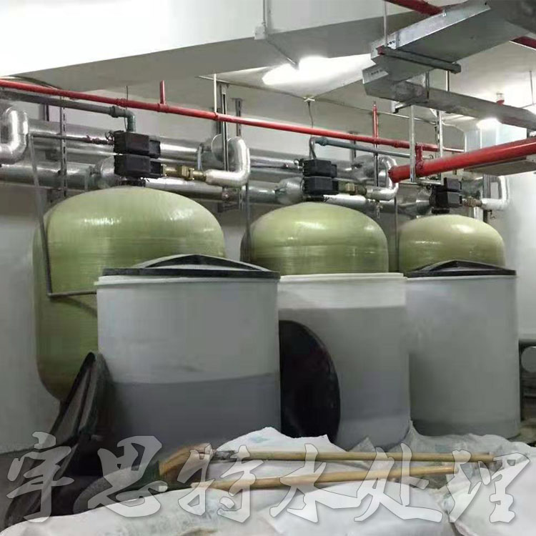 原水在一定的壓力、流量下,通過控制器,進入裝有離子交換樹脂的容器(樹脂罐),樹脂中所含的Na+與水中的陽離子(Ca2+,Mg2+,Fe2+……等)進行交換,使容器出水的Ca2+,Mg2+離子含量達到既定的要求,實現了硬水的軟化。