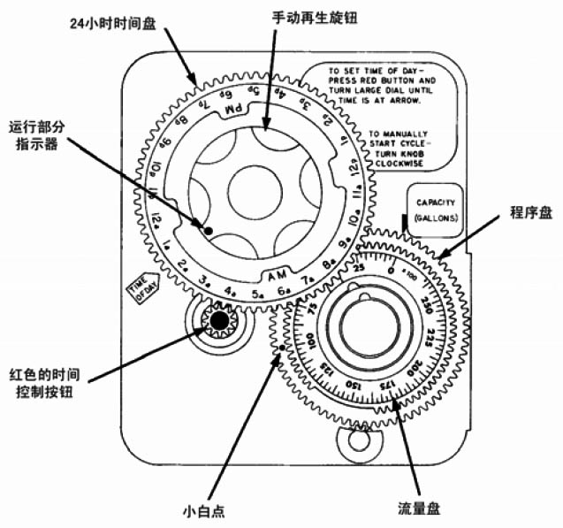 當出水硬度超標時,也可手動順時針方向旋轉手動再生輪,軟水器則啟動再生程序,并將按照設定工作步驟完成一個再生循環,直至返回工作狀態(產軟水),同時在手動再生輪缺口處顯示每一工作步驟名稱。